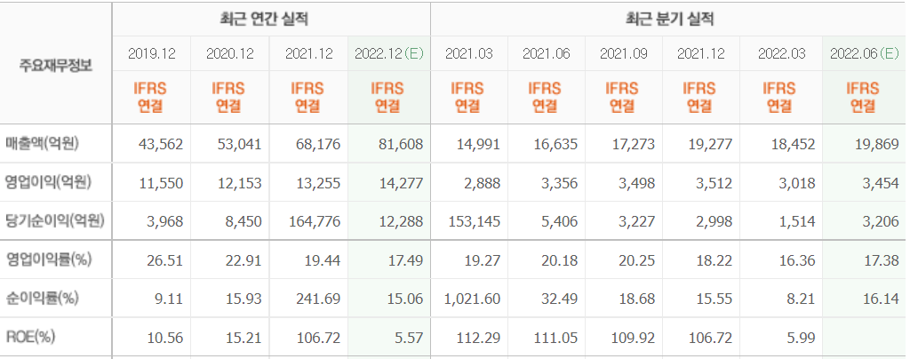 2022년 3월 전년동기 대비 연결기준 매출액은 23.1% 증가, 영업이익은 4.5% 증가, 당기순이익은 98.9% 감소하였습니다. 전년 동기 대비 주요 사업 부문이 고르게 성장하여 영업이익이 증가하였습니다.