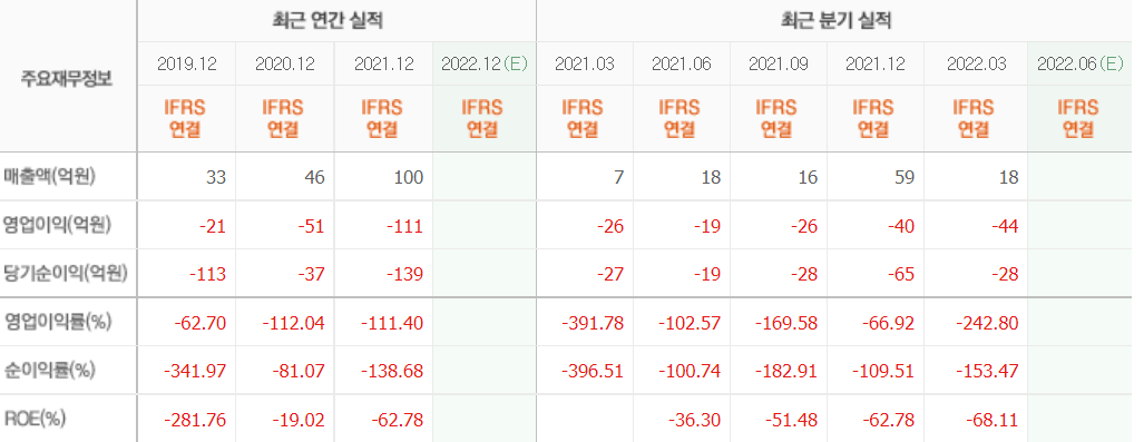 2022년 3월 전년동기 대비 연결기준 매출액은 166.4% 증가, 영업손실은 65.1% 증가, 당기순손실은 2.1% 증가하였습니다. 전년 동기 대비 매출액이 대폭 증가했으며, 이에 판관비, 인건비 및 복리후생비 또한 증가하며 영업 손실폭 더 증가하였습니다.