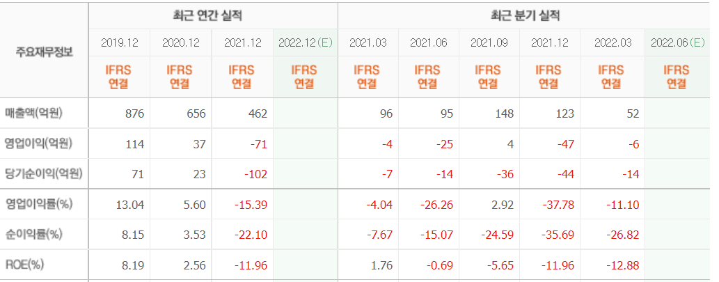 2022년 3월 전년동기 대비 연결기준 매출액은 26.2% 감소, 영업이익 흑자전환, 당기순손실은 74.7% 감소하였습니다.