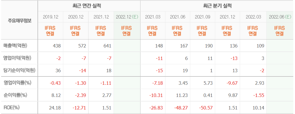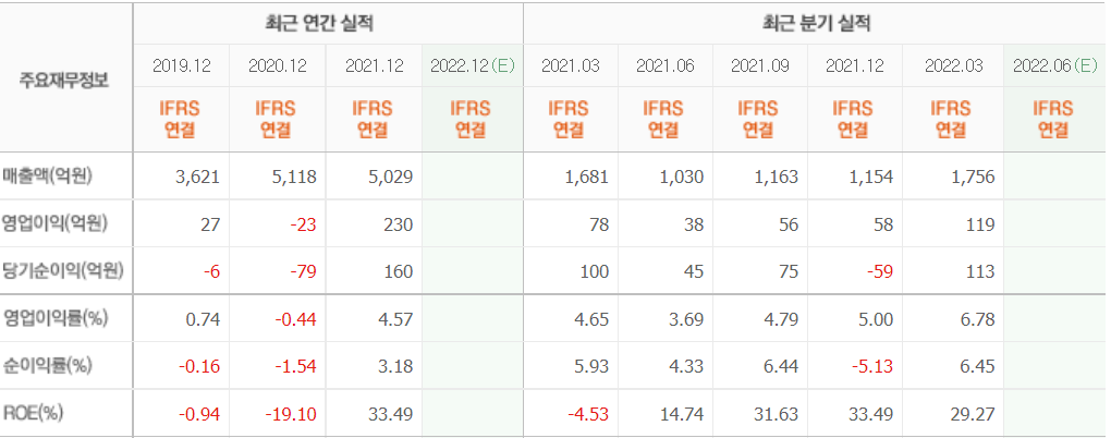 2022년 3월 전년 동기 대비 연결기준 매출액은 45.3% 감소, 영업손실은 50.3% 증가, 당기순손실은 91.4% 증가했습니다. 매출액이 감소한 모습을 보였는데, 수주액이 전년동기 대비 감소하지는 않았으나 기납품액 규모가 많이 감소한 모습을 보이면서 매출액이 감소함에 따라 영업손실도 증가하였습니다.